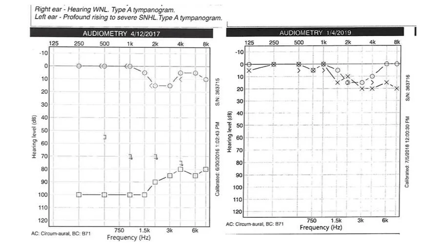 Two of my audiograms — 3 days post-hearing loss (left) and almost two years after recovery (right)